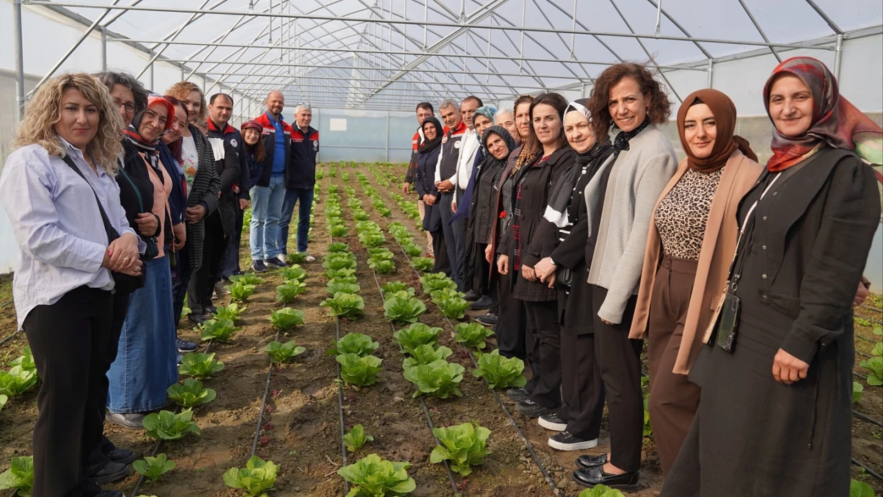 Hanönü Halk Eğitim Merkezinde kadınlar tarafından üretilen el emeği ürünler ziyaret edilirken, Hanyöresi Kadın Kooperatifi ortağı Hülya YIıldırım’a ait serada da incelemelerde bulunuldu.