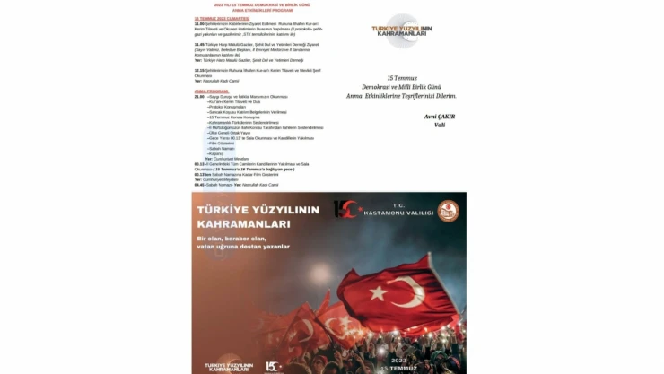 15 Temmuz Demokrasi ve Milli Birlik Günü kapsamında ilk olarak saat 11.00’da şehitlerin kabirleri ziyaret edilerek, dua edilecek. Akabinde il protokolü tarafından Türkiye Harp Malulü, Gaziler, Şehit, Dul ve Yetimler Derneği ziyaret edilecek. Anma programı kapsamında Nasrullah Kadı Camii’nde şehitlerin ruhuna ithafen Mevlid-i Şerif okunacak.