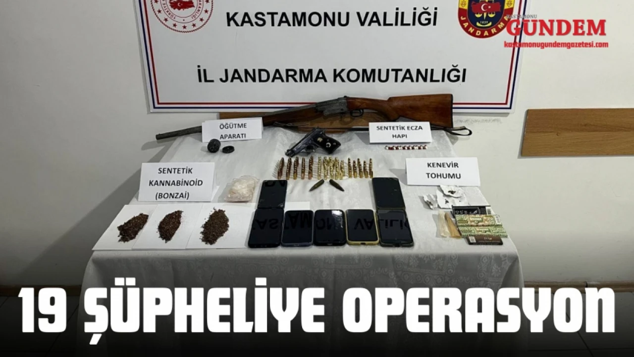 Edinilen bilgiye göre, İl Jandarma Komutanlığı tarafından "narkotik suçlarla mücadele" kapsamında gerçekleştirilen teknik ve fiziki takip çalışmaları neticesinde 19 şüpheliye yönelik yapılan aramalarda 416 gr metamfetamin, 45 gr kubar esrar, 3 gr kenevir tohumu, 940 gr bonzai/sentetik kannabinoid katkılı tütün, 54 gr bonzai/sentetik kannabinoid ham maddesi, 22 adet uyuşturucu kullanma aparatı, 2 adet hassas terazi, 88 bin 100 TL nakit para, 3 adet tabanca, 97 adet tabanca mermisi, 3 adet av tüfeği, 28 adet cep telefonu ele geçirildi. Adli makamlara çıkarılan 19 şüpheliden 4'ü tutuklanarak Ceza İnfaz Kurumuna teslim edildi.