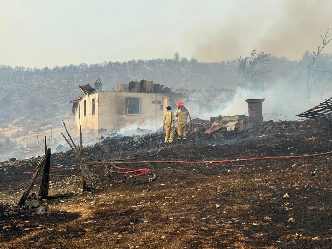 Köye giren ekipler, yangının diğer evlere sıçramaması için müdahalesini sürdürüyor.