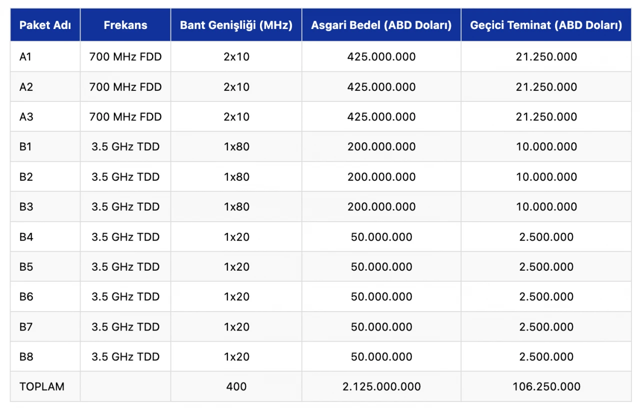 700 MHz ve 3,5 GHz bantlarında toplam 400 MHz'lik frekans kaynağının asgari değer toplamı KDV hariç yaklaşık 2 milyar 125 milyon dolar olacak.