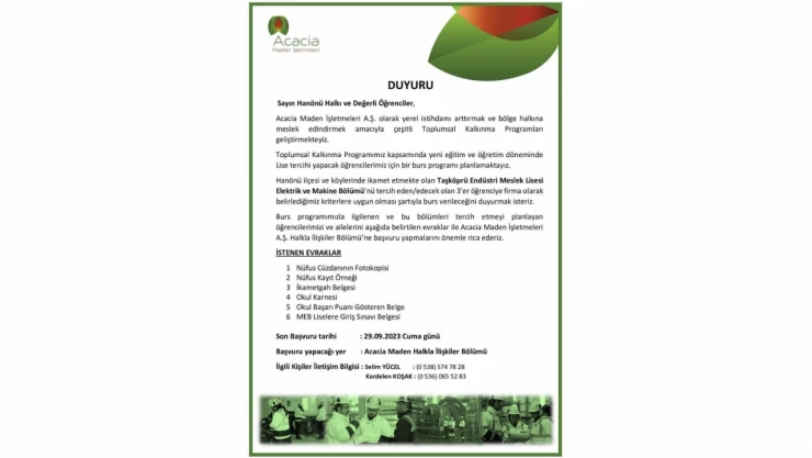Acacia Maden İşletmeleri’nden yapılan duyuruda; “Sayın Hanönü halkı ve değerli öğrenciler, Acacia Maden İşletmeleri A.Ş. olarak yerel istihdamı arttırmak ve bölge halkına meslek edindirmek amacıyla çeşitli Toplumsal Kalkınma Programları geliştirmekteyiz. Toplumsal Kalkınma Programımız kapsamında yeni eğitim ve öğretim döneminde Lise tercihi yapacak öğrencilerimiz için bir burs programı planlamaktayız. Hanönü ilçesi ve köylerinde ikamet etmekte olan Taşköprü Endüstri Meslek Lisesi Elektrik ve Makine Bölümü'nü tercih eden/edecek olan 3'er öğrenciye firma olarak belirlediğimiz kriterlere uygun olması şartıyla burs verileceğini duyurmak isteriz. Burs programımızla ilgilenen ve bu bölümleri tercih etmeyi planlayan öğrencilerimizi ve ailelerini aşağıda belirtilen evraklar ile Acacia Maden İşletmeleri A.Ş. Halkla İlişkiler Bölümü’ne başvuru yapmalarını önemle rica ederiz” denildi.