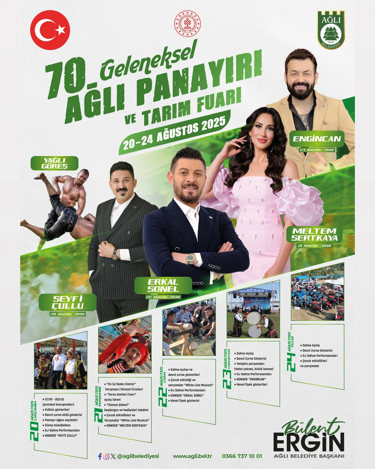 Ağlı Belediyesi, ilçenin simgesi haline gelen Geleneksel Ağlı Panayırı ve Tarım Fuarı'nın 70'incisini 20-24 Ağustos 2025 tarihlerinde düzenleyecek.