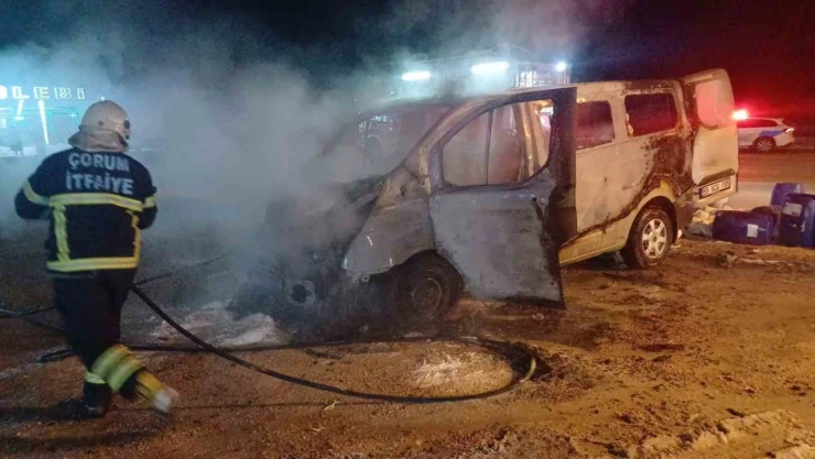 Çorum’da seyir halindeyken alevlere teslim olan hafif ticari araç kullanılmaz hale geldi. Yangın itfaiye ekiplerinin müdahalesi ile söndürüldü.