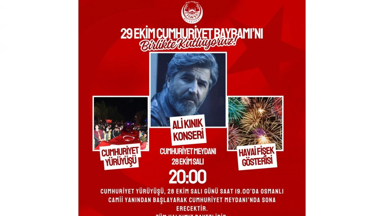 Tosya'da 29 Ekim Cumhuriyet Bayramı münasebetiyle 28 Ekim Salı günü Ali Kınık konseri düzenlenecek.