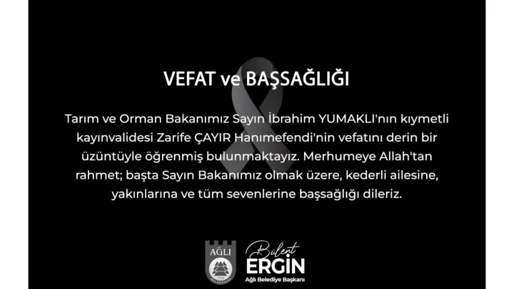 Ağlı Belediye Başkanı Bülent Ergin, Tarım ve Orman Bakanı İbrahim Yumaklı'nın kayınvalidesi Zarife Çayır'ın vefatı dolayısıyla taziye mesajı yayımladı.