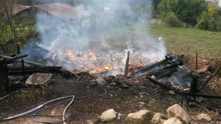 Boyalı mevkisindeki Köklüdere köyünde çıkan yangında alt kısmı ahır olarak kullanılan iki katlı ahşap ev yanarak küle döndü.
