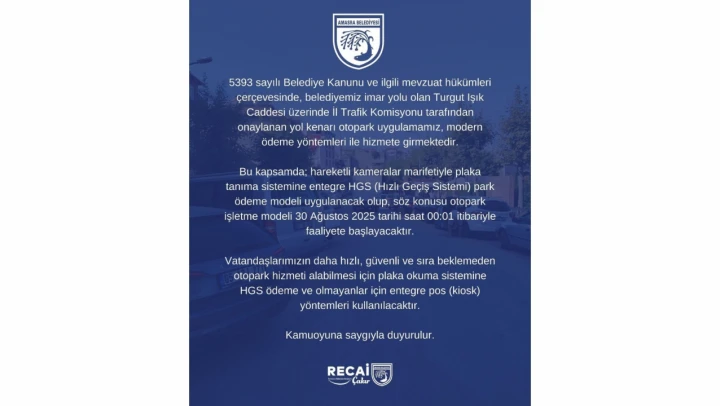 Bartın'ın Amasra ilçesinde Hızlı Geçiş Sistemi (HGS) park ödeme modeli uygulanmaya başladı. İlçe Belediye Başkanı Recai Çakır, Turgut Işık Caddesi yol kenarında uygulanmaya başlanan HGS park uygulaması hakkında konuştu. Başkan Çakır, 'Vatandaşlarımızın daha hızlı, güvenli ve sıra beklemeden otopark hizmeti alabilmesi için plaka okuma sistemine HGS ödeme ve olmayanlar için entegre pos (kiosk) yöntemleri kullanılacaktır' dedi.