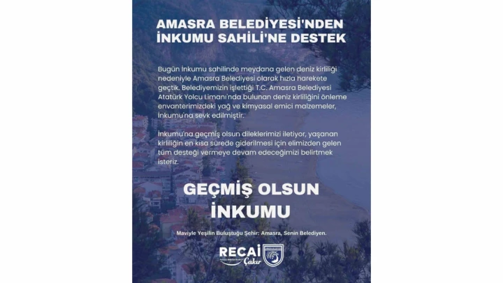 Bartın'da İnkumu denizine dökülen yakıt sonrasında ekipler temizleme çalışmalarına hızla başladı. 20 Haziran Cuma günü öğleden sonra meydana gelen deniz kirliliği sebebiyle bölgede 2 gün boyunca denize girmek yasaklandı. Ekipler temizleme çalışmalarını sürdürürken Amasra Belediyesi'nden bölgeye malzeme desteği sağlandı. Denizin en kısa sürede temizlenmesi için gereken desteği verdiklerini belirten Amasra Belediye Başkanı Recai Çakır, 'İnkumu sahilinde meydana gelen deniz kirliliği nedeniyle Amasra Belediyesi olarak hızla harekete geçtik. Belediyemizin işlettiği T.C. Amasra Belediyesi Atatürk Yolcu Limanı'nda bulunan deniz kirliliğini önleme envanterimizdeki yağ ve kimyasal emici malzemeler, İnkumu'na sevk edilmiştir. İnkumu'na geçmiş olsun dileklerimizi iletiyor, yaşanan kirliliğin en kısa sürede giderilmesi için elimizden gelen tüm desteği vermeye devam edeceğimizi belirtmek isteriz. Geçmiş olsun İnkumu' ifadelerine yer verdi.