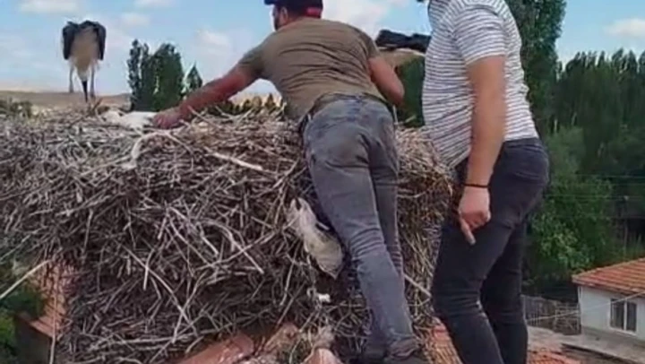 Çorum'da bir evin çatısında bulunan leyleğin ayağına dolanan ip, itfaiye ekiplerinin müdahalesiyle çıkarıldı. Kurtarılan leylek yeniden doğal yaşam alanına bırakıldı.
