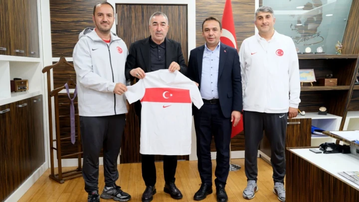 Türkiye Futbol Federasyonu U14 Millî Takım Kastamonu Bölge Seçmeleri için şehrimize gelen Genç Milli Takımlar Teknik Koordinatörü Samet Aybaba, beraberindeki heyetle Belediye Başkanı Hasan Baltacı'yı makamında ziyaret etti.