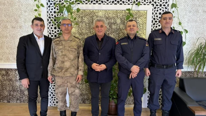 Jandarma Kıdemli Albay Murat Kırbaç, İl Jandarma Komutanı Jandarma Kıdemli Albay Hikmet Uz ve Jandarma Kıdemli Üsteğmen Gökhan Satılmış, Belediye Başkanı Ahmet Demir'i makamında ziyaret etti.