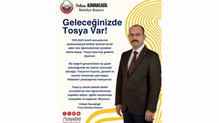 Başkan Kavaklıgil yaptığı paylaşımda; 'YKS 2025 tercih sonuçlarının açıklanmasıyla birlikte ilçemizi tercih eden tüm öğrencilerimizi yürekten tebrik ediyor, Tosya'mıza hoş geldiniz diyorum. Siz değerli gençlerimizin bu güzel yolculuğunda her zaman yanınızda olacağız. Tosya'nın huzurlu, güvenli ve samimi ortamında yeni başarı hikyeleri yazacağınıza inanıyorum. Tosya'yı tercih ederek bizleri onurlandıran tüm öğrencilerimize teşekkür ediyor, eğitim hayatınızda kolaylıklar ve başarılar diliyorum.' ifadelerine yer verdi.