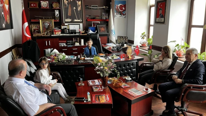 Bilim ve Sanat Merkezi Müdürü Sümeyye Birinci, öğrenciler Aylin Kurtoğlu ve Ali Karagüllü, Türkiye Büyük Millet Meclisi'nin açılışının 105'inci yıldönümü ve 23 Nisan Ulusal Egemenlik ve Çocuk Bayramı programı kapsamında İnebolu Belediye Başkanı Engin Uzuner'i, makamında ziyaret etti.