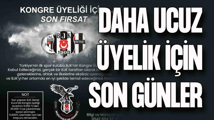Bilgi ve müracaat için 0542 654 32 77 telefon numarası verilirken söz konusu bildiriye şu not eklendi: Son yapılan BJK Genel Kurulu'nda kongre üyeliği ücretinin 5 bin liradan 20 bin liraya çıkartılması kararı alınmıştır. 5 bin lira üzerinden son kez başvuru alınacaktır.”