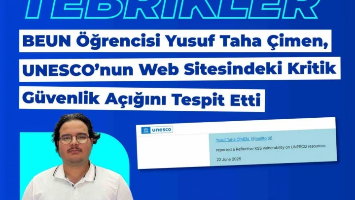 Zonguldak Bülent Ecevit Üniversitesi (BEUN) Mühendislik Fakültesi Bilgisayar Mühendisliği öğrencisi Yusuf Taha Çimen, UNESCO'nun resmi web sitesinde kritik bir 'Reflective XSS' güvenlik açığını tespit etti. Çimen, açığın raporlanmasıyla UNESCO'nun resmi sayfasında listelenerek uluslararası platformda dikkat çekti.