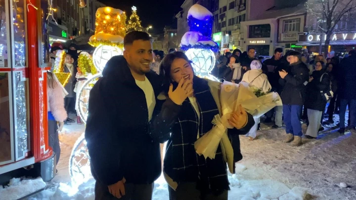 Bolu'da vatandaşlar 2026 yılına coşkuyla girdi. Kentin en işlek noktası olan İzzet Baysal Caddesi'nde toplanan yüzlerce kişi, soğuk havaya aldırış etmeden doyasıya eğlendi. Kimileri oyun havası oynayarak yeni yılı karşılarken, kalabalığın ortasında yapılan sürpriz evlilik teklifi renkli görüntülere sahne oldu.