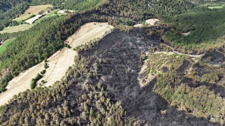 Bolu'nun Göynük ilçesinde ormanlık alanda çıkan yangında kül olan 25 hektarlık bölge havadan dron ile görüntülendi.