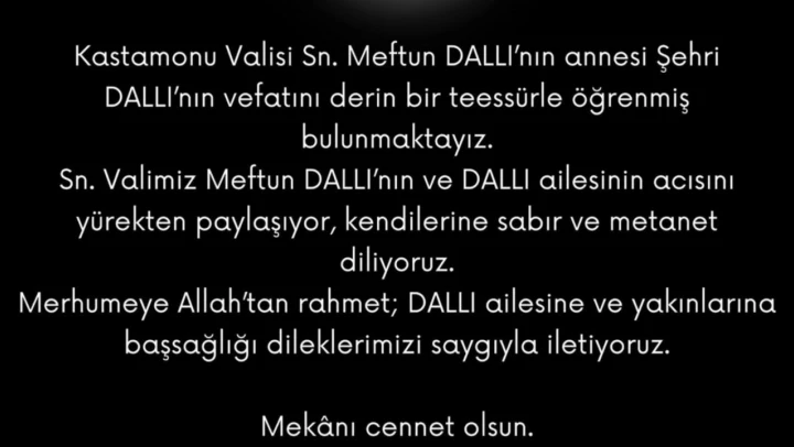 Başkan Demir mesajında, 'Kastamonu Valisi Sn. Meftun Dallı'nın annesi Şehri Dallı'nın vefatını derin bir teessürle öğrenmiş bulunmaktayız. Sn. Valimiz Meftun Dallı'nın ve Dallı ailesinin acısını yürekten paylaşıyor, kendilerine sabır ve metanet diliyoruz. Merhumeye Allah'tan rahmet; Dallı ailesine ve yakınlarına başsağlığı dileklerimizi saygıyla iletiyoruz. Meknı cennet olsun' ifadelerine yer verdi.