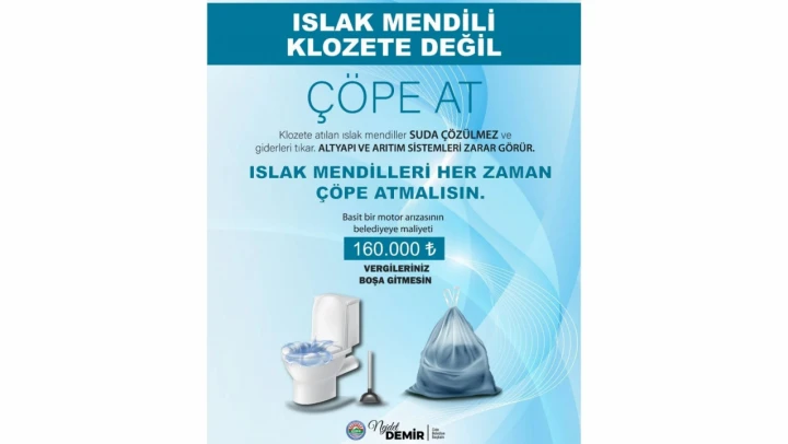 Vatandaşların bu konuda duyarlı olmaları çağrısında bulunan Cide Belediyesi açıklamasında; 'Islak Mendili Çöpe At. Günlük hayatta sıkça kullandığımız ıslak mendiller, klozete atıldığında suyla çözünmediği için giderlerde tıkanmalara, taşkınlara ve çevresel sorunlara yol açmakta. Bu basit gibi görünen hata, hem altyapıya, hem arıtım tesislerine, hem de doğaya büyük zararlar vermekte. Basit bir motor arızasının belediyemize maliyeti 160.000 ₺. Vergileriniz boşa gitmesin. Unutmayalım, klozet çöp değildir. Islak mendilleri doğru şekilde, çöp kutusuna atarak hem çevremizi koruyabilir hem de altyapı sistemimizin sağlıklı işlemesine katkı sağlayabiliriz.' ifadelerine yer verdi.