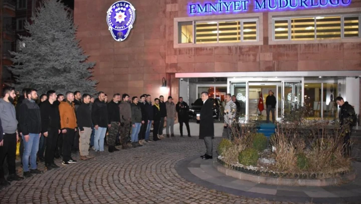 İl Emniyet Müdürlüğü'nce, 7,7 ve 7,6 büyüklüğündeki depremlerin merkezi Kahramanmaraş'ta asayişi sağlamak ve yürütülen çalışmalara destek olmak amacıyla 60 personel görevlendirildi. Emniyet binası önünde hazır bekleyen personel, İl Emniyet Müdürü Kayhan Ay tarafından deprem bölgesine uğurlandı. (iha)