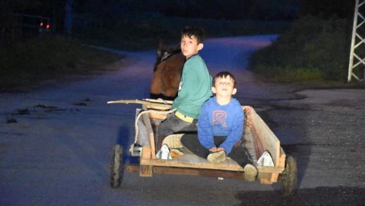 Sinop'un Erfelek ilçesi Akçaçam köyünde 2 erkek çocuğun, trafiğin işlek olduğu yolda derme çatma eşek arabasıyla yaptıkları tehlikeli yolculuk kameralara yansıdı. Görüntülerde, çocukların eşek arabasının arkasında uyuduğu ve uyandığı gözlemlendi. Daha sonra uyanan çocuklardan biri eşeğe sopayla vurarak eşek arabasını hızlandırmak istediği görülüyor.