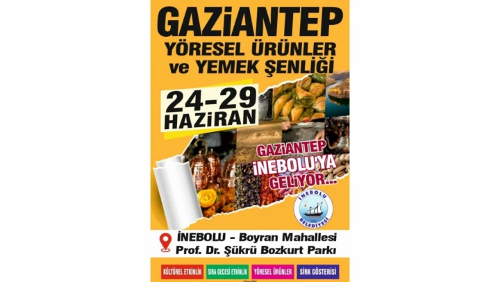 'Gaziantep İnebolu'ya Geliyor! Gaziantep'in eşsiz lezzetleri ve yöresel ürünleri, 24-29 Haziran tarihleri arasında tam 6 gün boyunca İnebolu'da sizlerle buluşuyor! Etkinlik kapsamında 3 gün sürecek unutulmaz Sıra Gecesi etkinlikleri, 3 gün boyunca heyecan dolu sirk gösterileri ve gün boyu çocukların keyifli vakit geçirebileceği ücretsiz oyun alanları Prof. Dr. Şükrü Bozkurt Parkı'nda sizi bekliyor. Gaziantep mutfağının zenginliklerini keşfetmek ve bu özel atmosferi yaşamak için tüm halkımızı davet ediyoruz. Kaçırmayın, bu benzersiz deneyimin bir parçası olun!'