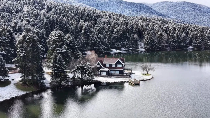Dron ile havadan kaydedilen görüntülerde, karla örtülü ağaçlar, gölet çevresi ve Devlet Konukevi'nin beyaz örtüyle uyumu dikkat çekti. Her mevsim yerli ve yabancı turistlerin uğrak noktası olan Gölcük Tabiat Parkı, kış aylarında da doğa ve fotoğraf tutkunlarının ilgisini çekmeye devam ediyor.