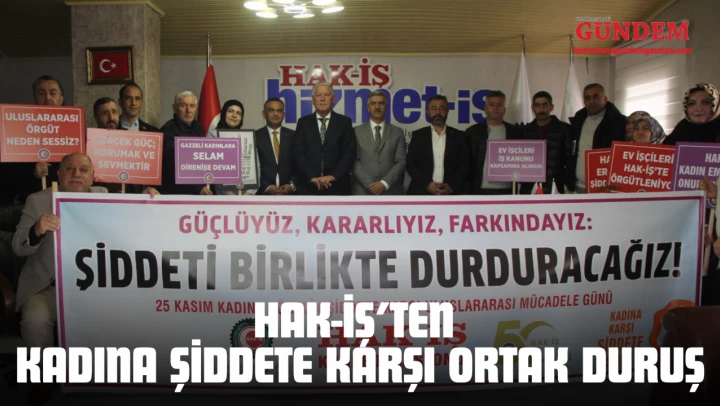 Toplumsal dayanışmanın önemine değinen, Hak-İş İl Başkanı Mustafa Çağlı; 'Çalışma hayatının her alanında öncü bir konfederasyon olan Hak-İş, kadın çalışanların örgütlü gücünün adresidir. Toplumsal şiddetin çözümünü yalnızca kadınların omuzlarına bırakamayız. Kadın–erkek birlikte haykırıyoruz; şiddet son bulmalıdır. Sendikal örgütlenmenin güçlenmesiyle toplumun bu yarasının iyileşeceğine inanıyoruz. Şiddetsiz bir geleceğin mümkün olduğuna; toplumsal dayanışma, ortak bilinç ve kararlı bir mücadele ile kadınların, çocukların ve tüm insanların güven içinde yaşayabileceği adil bir dünyanın mutlaka inşa edileceğine yürekten inanıyoruz. Birlikte güçlü, birlikte kararlıyız. TÜİK Kadına Yönelik Şiddet Araştırması'na göre kadınların yaşamlarının herhangi bir döneminde yüzde 28,2'si psikolojik, yüzde 18,3'ü ekonomik, yüzde 12,8'i fiziksel şiddete maruz kalmıştır. Boşanan kadınlarda bu oranlar çok daha yüksektir. Son 12 ayda kadınların yüzde 11,6'sı psikolojik, yüzde 3,7'si dijital, yüzde 3,1'i ısrarlı takibe yüzde 2,6'sı fiziksel şiddete uğramıştır. Bu veriler, ülkemizdeki şiddetin yaygınlığını ve acil müdahale gerekliliğini açıkça ortaya koymaktadır. Bizler, Hak-İş'li kadın ve erkek emekçiler olarak, çalışma hayatında kadına yönelik şiddet ve tacizin önlenmesine yönelik önerilerimizi sıralamaktayız. Sendikal örgütlenme özgürlüğünü sınırlayan tüm engeller kaldırılmalıdır. ILO C190 onaylanmalı ve toplu iş sözleşmelerine uyarlanması sağlanmalıdır. İşyerlerinde 'Şiddete Sıfır Tolerans Politikasının' hayata geçirilmelidir. Kadın ve aile dostu işyerlerinin teşvik edilmelidir. Eşit değerde işe eşit ücret için etkin kamu etkin denetim yapılmalıdır. Kayıt dışılığın ve cinsiyete dayalı ücret açığının giderilmesi için sendikal örgütlenme güçlendirilmelidir. Bakım yükünün toplumsal bir mesele olarak ivedilikle ele alınmalıdır. Şiddet tehdidi altındaki çalışanlara tayin, fesih, esnek çalışma, izin ve yeniden işe alımda öncelik hakkı tanınmasını, yeni medya ve dijital platformlarda şiddeti özendiren, normalleştiren ve kadınları hedef alan içeriklere karşı etkin düzenlemeler yapılmalı; dijital mecralar denetlenerek çevrim içi şiddetle mücadele güçlendirilmelidir. Hukuki düzenlemeler, toplumsal ahlkı ve değerleri güçlendirecek şekilde güncellenmeli; şiddeti meşrulaştıran, teşvik eden veya cezasızlığı doğuran boşluklar ivedilikle giderilmelidir. Kadına yönelik şiddet suçlarında cezalar caydırıcı şekilde artırılmalıdır. Kadınların ve çocukların güvenle yaşayabileceği, aydınlatması, ulaşımı, kent planlaması ve sosyal donatılarıyla koruyucu-önleyici niteliği yüksek güvenli şehirler oluşturulmalıdır. Kadın ve aile dostu işyerleri teşvik edilmeli; çalışma alanlarının sosyal, fiziksel ve yönetsel açıdan güvenli hle getirilmesi için destek programları hayata geçirilmelidir. İşyerlerinde sektör bazlı şiddet ve taciz risk analizi yapılmalı; sektörel şiddet araştırmalarının sonuçlarına göre bağlayıcı önlemler geliştirilmelidir. Şiddete maruz kalan çalışanların hukuki, psikolojik ve sosyal destek mekanizmalarına hızlı erişimi sağlanmalı; işverenler bu süreçte etkin sorumluluk almalıdır. Hak-İş, etkin bir 'Şiddeti Önleme ve İzleme Komitesi' kurulmasını ve bu yapının sivil toplumla güçlü iş birliği yürütmesini talep etmektedir. Tüm emekçi kadınları, 'Emekçilerin Güvenli Limanı' HAK-İŞ çatısı altında dayanışmaya davet ediyoruz. Gelin Eşitsizliğe, adaletsizliğe, istismara ve şiddete karşı haklarımız için birlikte mücadele edelim. Yarım asırlık mücadelesiyle Hak-İş; birlik, mücadele ve dayanışmanın savunucusu olmayı sürdürmektedir. Hak-İş olarak, 25 Kasım Kadına Yönelik Şiddete Karşı Uluslararası Mücadele Günü vesilesiyle, dünya genelinde zulme uğrayan ve şiddete maruz kalan kadınlara, çocuklara ve tüm canlılara yönelik her türlü şiddet ve ayrımcılıkla mücadelemizi kararlılıkla sürdüreceğimizi kamuoyuna ilan ediyoruz. Şiddetin her türlüsünün son bulduğu bir çalışma hayatı ve dünya temennisiyle. Hak-iş olarak, şiddetin her türlüsüyle mücadelemizi kararlılıkla sürdüreceğimizi kamuoyuna bir kez daha ilan ediyoruz. Kadın cinayetlerine kurban giden tüm kadınlara ve aralarında teşkilatımızın değerli kadın üyelerinin de bulunduğu tüm mağdurlara Allah'tan rahmet diliyor, ailelerine sabır ve metanet temenni ediyoruz. Yaşasın emeğin onuru, yaşasın kadın erkek dayanışması, yaşasın Hak-İş'in mücadelesi' şeklinde konuştu.