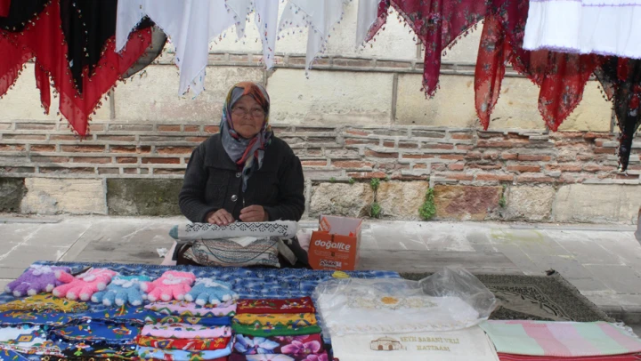 Hanımelleri Pazarı'nda 69 yaşındaki Melek Çuvadaroğlu yaptığı oya ve örgü işlerini satarak hem boş zamanlarını değerlendiriyor hem de aile bütçesine katkıda bulunuyor.