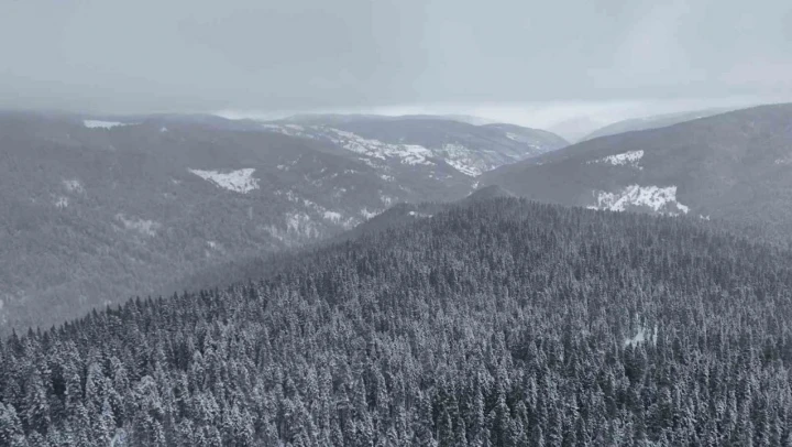 Çankırı-Kastamonu sınırındaki Ilgaz Dağı, kar yağışıyla beyaz örtüyle kaplandı. Ortaya çıkan kartpostallık manzara havadan görüntülendi.