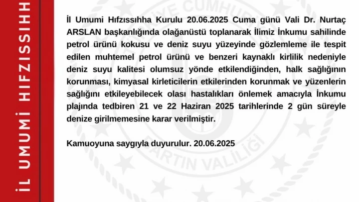 Bartın Valiliğinden yapılan açıklamada, 'İl Umumi Hıfzısıha Kurulu 20 Haziran 2025 Cuma günü Vali Dr. Nurtaç Arslan başkanlığında olağanüstü toplanarak ilimiz İnkumu sahilinde petrol ürünü kokusu ve deniz suyu yüzeyinde gözlemleme ile tespit edilen muhtemel petrol ürünü ve benzeri laynaklı kirlilik nedeniyle deniz suyu kalitesi olumsuz yönde etkilendiğinden, halk sağlığının korunması, kimyasal kirleticilerin etkilerinden korunmak ve yüzenlerin sağlığını etkileyebilecek hastalıkları önlemek amacıyla İnkumu plajında tedbiren 21 ve 22 Haziran 2025 tarihlerinde 2 gün süreyle denize girilmemesine karar verilmiştir' ifadelerine yer verildi.