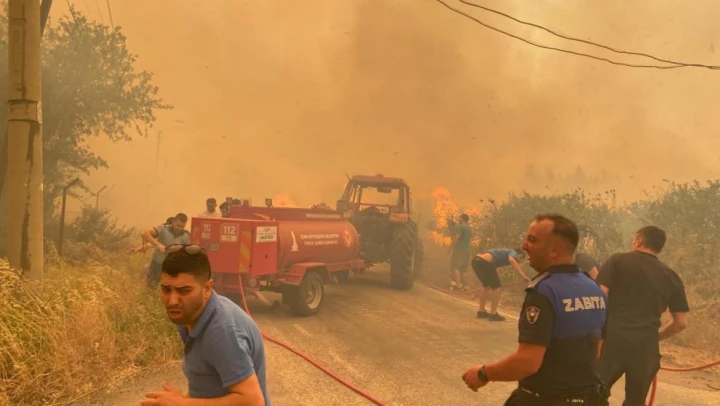 İzmir'in Menderes ilçesinde, saat 13.00 sıralarında başlayan orman yangını devam ederken, alevlerin ulaştığı 5 mahalledeki vatandaşların evlerinden tahliye edildiği öğrenildi.