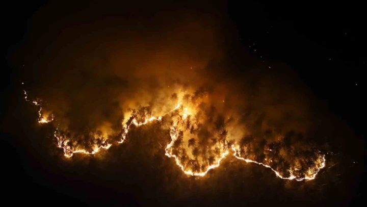 Karabük'te 12. saate girilen ve geceyi aydınlatan orman yangını dron ile görüntülenirken, ekiplerin karadan söndürme çalışmaları aralıksız devam ediyor.