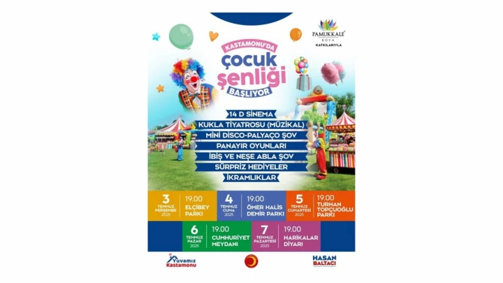 Kastamonu Belediyesi, yaz tatiline renk katacak 5 günlük Çocuk Şenliği ile miniklere unutulmaz anlar yaşatmaya hazırlanıyor. Kukla tiyatrosundan 14D sinemaya, palyaço şovlarından panayır oyunlarına kadar pek çok etkinliğin yer alacağı şenlikte, İbiş ve Neşe Abla gösterisi, şişme oyun parkurları, sürpriz hediyeler ve çeşitli ikramlar da çocukları bekliyor.