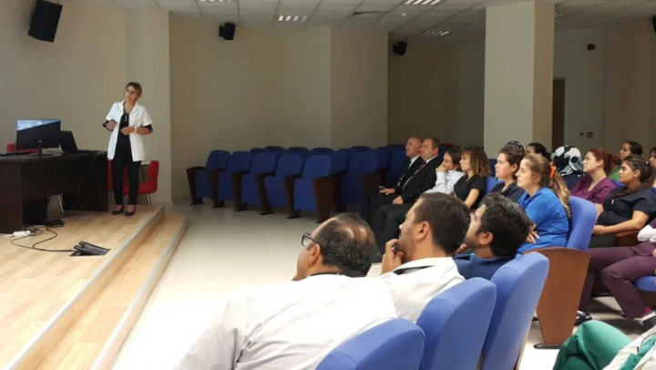 Kamu Hastaneler Birliği Genel Sekreteri Dr. İsmail Yücel, Halk Sağlığı Müdürü Dr. Yüksel Kutlu, hastanede görev yapan sağlık çalışanları ve doktorların katıldığı SEPSİS Farkındalık Eğitim Toplantısı Türk Yoğun Bakım Derneği eğitmeni ve KDH Anestezi ve reanimasyon Uzman Dr. Ayşe Yılmaz tarafından, verilen SEPSİS farkındalık eğitimine katılan sağlık çalışanları ve doktorlara bilgiler verildi.