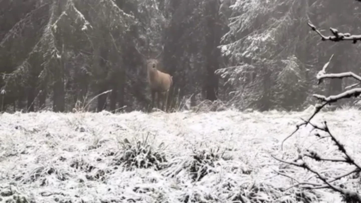Bolu'nun karla kaplı ormanlarında karların arasından yavaş adımlarla ilerlerleyen kızılgeyik böğürme anlarıyla vatandaş kamerasına yansıdı.