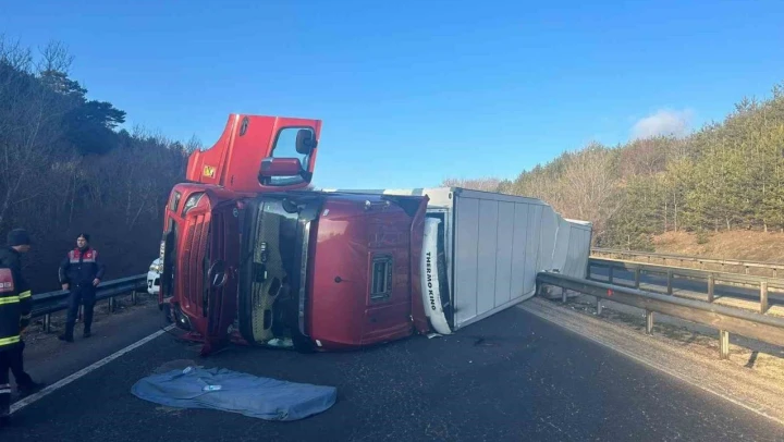 Bolu'nun Gerede ilçesinde D-100 karayolunda kontrolden çıkan tır devrildi. Kazada tır sürücüsü yaralandı.