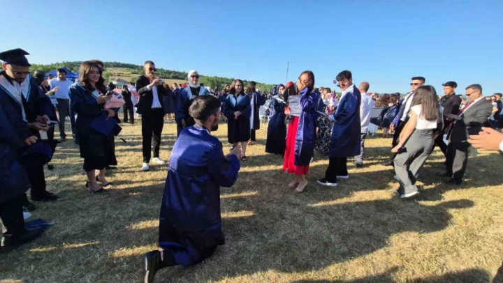 Bartın Üniversitesi'nin mezuniyet töreninde bir genç, binlerce kişinin meraklı bakışları arasında kız arkadaşına evlilik teklifinde bulundu.