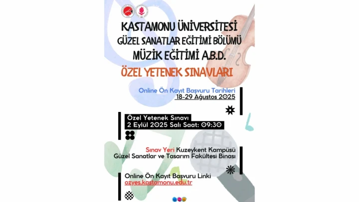 Kastamonu Üniversitesi'nden yapılan duyuruda; 'Eğitim Fakültesi Güzel Sanatlar Eğitimi Bölümü Resim-İş Eğitimi ve Müzik Eğitimi Özel Yetenek Sınavı için çevrimiçi başvurular 18-29 Ağustos 2025 tarihleri arasında kabul edilecek ve Özel Yetenek Sınavı 2 Eylül 2025 tarihinde yapılacaktır' denildi.