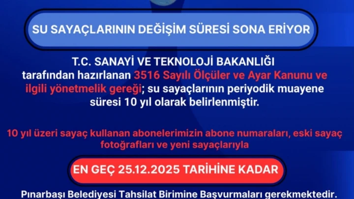 Belediye, kullanım süresi 10 yılı aşmış sayaçlara sahip abonelerin 25 Aralık 2025 tarihine kadar sayaç değişimi işlemleri için Pınarbaşı Belediyesi Tahsilat Birimine müracaat etmeleri gerektiğini açıkladı. Başvuru sırasında abone numarası ve eski sayaç bilgilerinin bulundurulmasının zorunlu olduğu belirtildi.