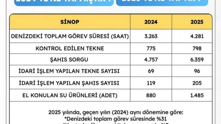 Sinop Valiliği, Sahil Güvenlik Karakol Komutanlığı tarafından 2024-2025 yıllarına ait faaliyet verilerini kamuoyuyla paylaştı.