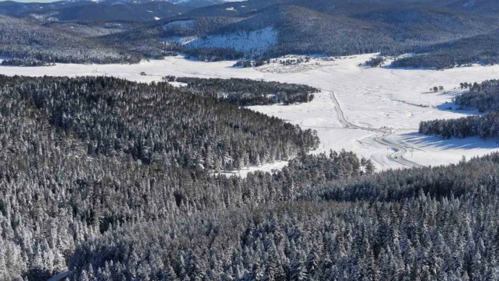 Bolu'nun güneydoğusunda Kartalkaya yolu üzerinde bulunan 14 köy yaylasından oluşan Sarıalan Yaylası, kış mevsiminin gelmesiyle birlikte beyaz örtüyle kaplandı. Yaylada oluşan kış manzarası havadan görüntülendi.