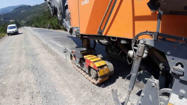 Bolu'da Karayolları ekipleri, Mudurnu-Akyazı kara yolunun bozuk bölümlerinde başlattığı asfalt yenileme çalışmalarına 40 dereceyi bulan sıcak havaya rağmen ara vermeden devam ediyor.