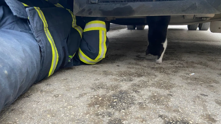 Taşköprü'de bir minibüsün motor kısmına sıkışan kedi yavrusu, itfaiye ekiplerince kurtarıldı.