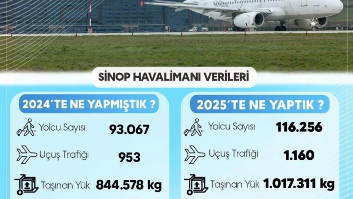 Açıklanan verilere göre, 2024 yılında Sinop Havalimanı'nı toplam 93 bin 67 yolcu kullanırken, yıl boyunca 953 uçuş gerçekleştirildi. Aynı dönemde havalimanı üzerinden 844 bin 578 kilogram yük taşındı. 2025 yılı verileri ise Sinop Havalimanı'ndaki hareketliliğin belirgin şekilde arttığını ortaya koydu. Buna göre, 2025 yılında havalimanını kullanan yolcu sayısı 116 bin 256'ya yükselirken, uçuş trafiği 1.160 sefer olarak kayıtlara geçti. Taşınan yük miktarı da 1 milyon 17 bin 311 kilogram olarak gerçekleşti.