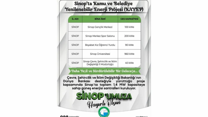 Sinop'ta Çevre, Şehircilik ve İklim Değişikliği Bakanlığı tarafından yürütülen KAYEP Projesi kapsamında, kentteki kamu binalarına güneş enerjisi santralleri kurulacağı açıklandı.