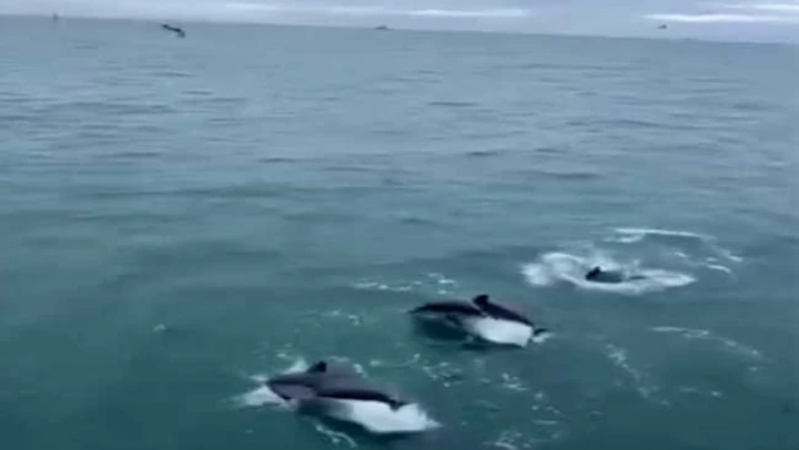 Sinop açıklarında avlanan balıkçılara eşlik eden yunus balıkları sürüsü, denizde görsel şölen oluşturdu. O anlar balıkçılar tarafından cep telefonu kamerasıyla kaydedildi.