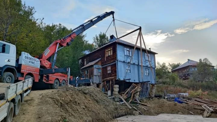 Sinop'un Ayancık ilçesine bağlı İnaltı köyünde, heyelan nedeniyle yan yatarak oturulamaz hale gelen iki katlı ahşap baba evini yıkmaya kıyamayan evlatları, evi vinçle farklı alana taşıttı.