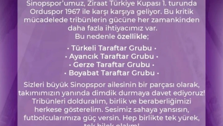 Kuzeyliler Taraftar Grubu tarafından yapılan açıklamada, '3 Eylül Çarşamba günü saat 16.30'da Sinopspor'umuz, Ziraat Türkiye Kupası 1. Turunda Orduspor 1967 ile karşı karşıya geliyor. Bu kritik mücadelede tribünlerin gücüne her zamankinden daha fazla ihtiyacımız var. Bu nedenle özellikle, Türkeli Taraftar Grubu, Ayancık Taraftar Grubu, Gerze Taraftar Grubu, Boyabat Taraftar Grubu Sizleri büyük Sinopspor ailesinin bir parçası olarak, takımımızın yanında dimdik durmaya davet ediyoruz! Tribünleri dolduralım, birlik ve beraberliğimizi herkese gösterelim. Sesimiz sahaya yansısın, futbolcularımıza güç versin. Hep birlikte tek yürek, tek bilek olalım' denildi.